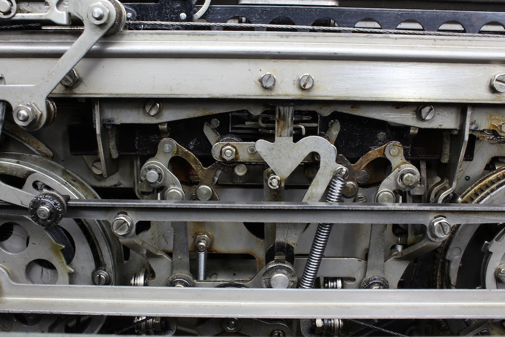 A closeup of part of the typebox positioning mechanism. I haven't cleaned this printing unit up yet:
