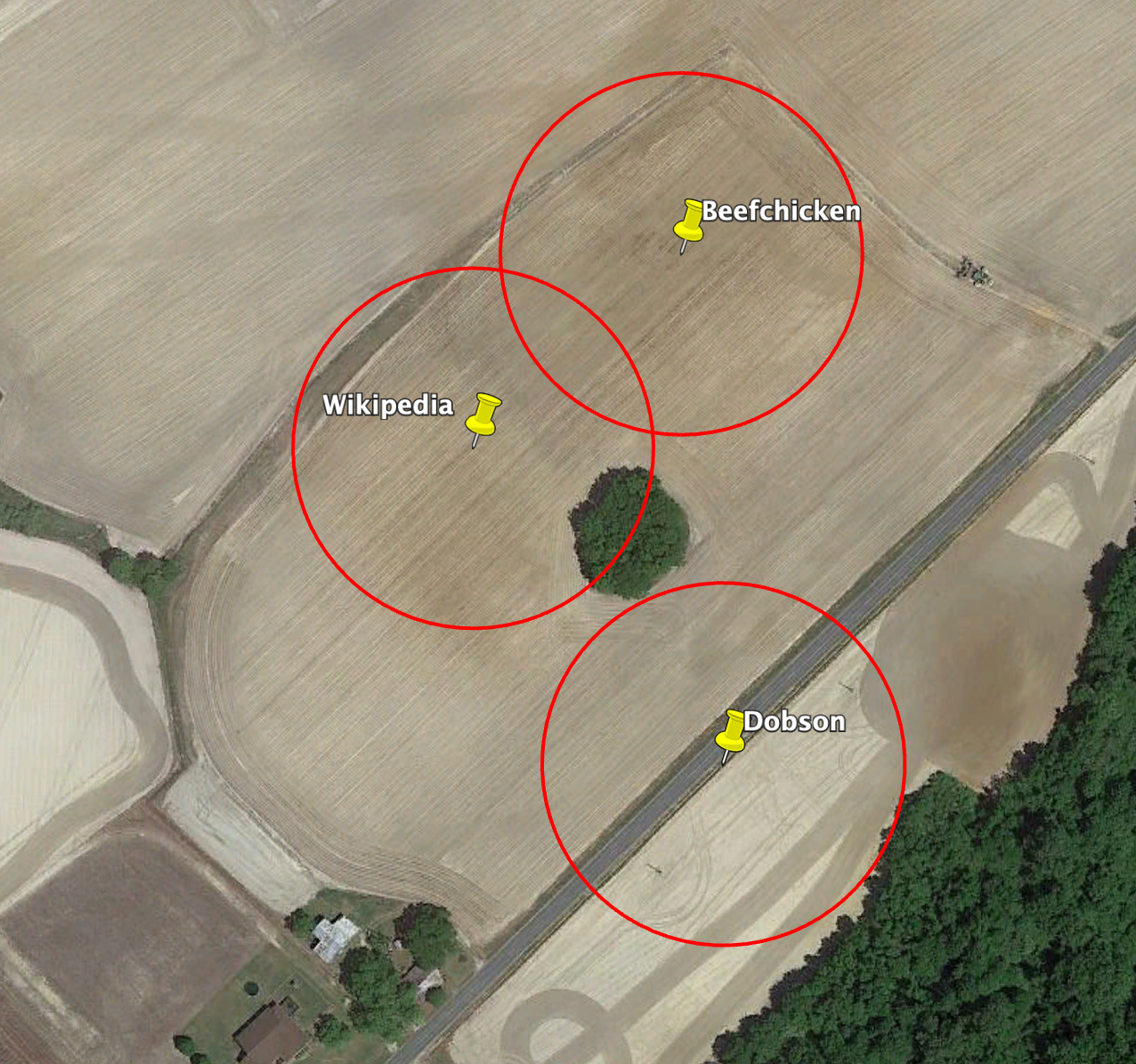 Do you see the problem? The coordinates given in Dobson's recollection do not match the coordinates given in the Wikipedia article. Dobson's coordinates are in the middle of Big Daddy’s Road. The source of the discrepancy is easy to discover. In the Talk page comments, one will find this note: