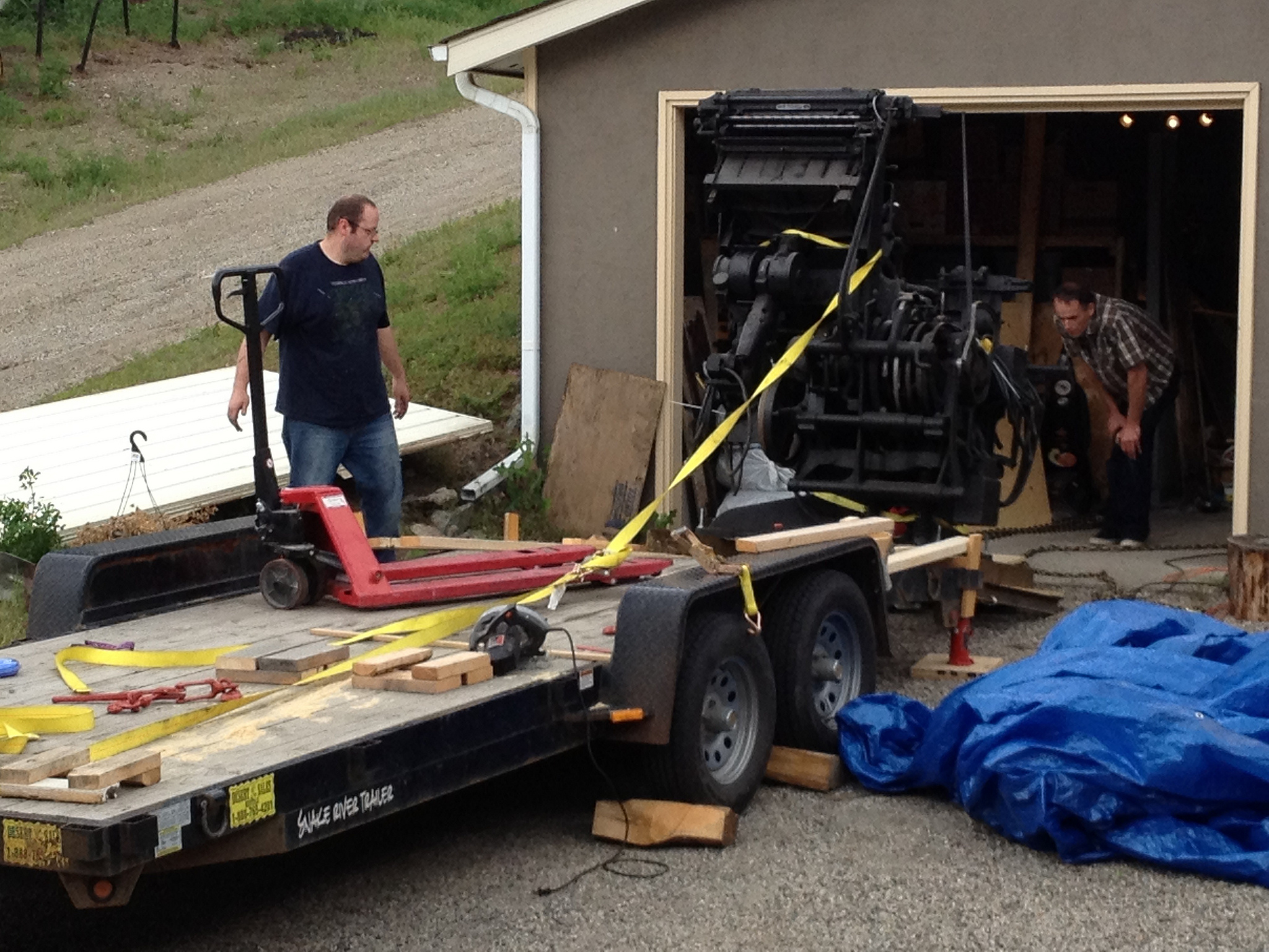 Once the trailer was backed up to my garage and chocked, my brother and I stood around and stared at the Linotype and trailer combination for over an hour, when it started to pour rain. Instead of working in the rain, we tarped the Linotype up, ordered pizza, and devised a plan for the next day.