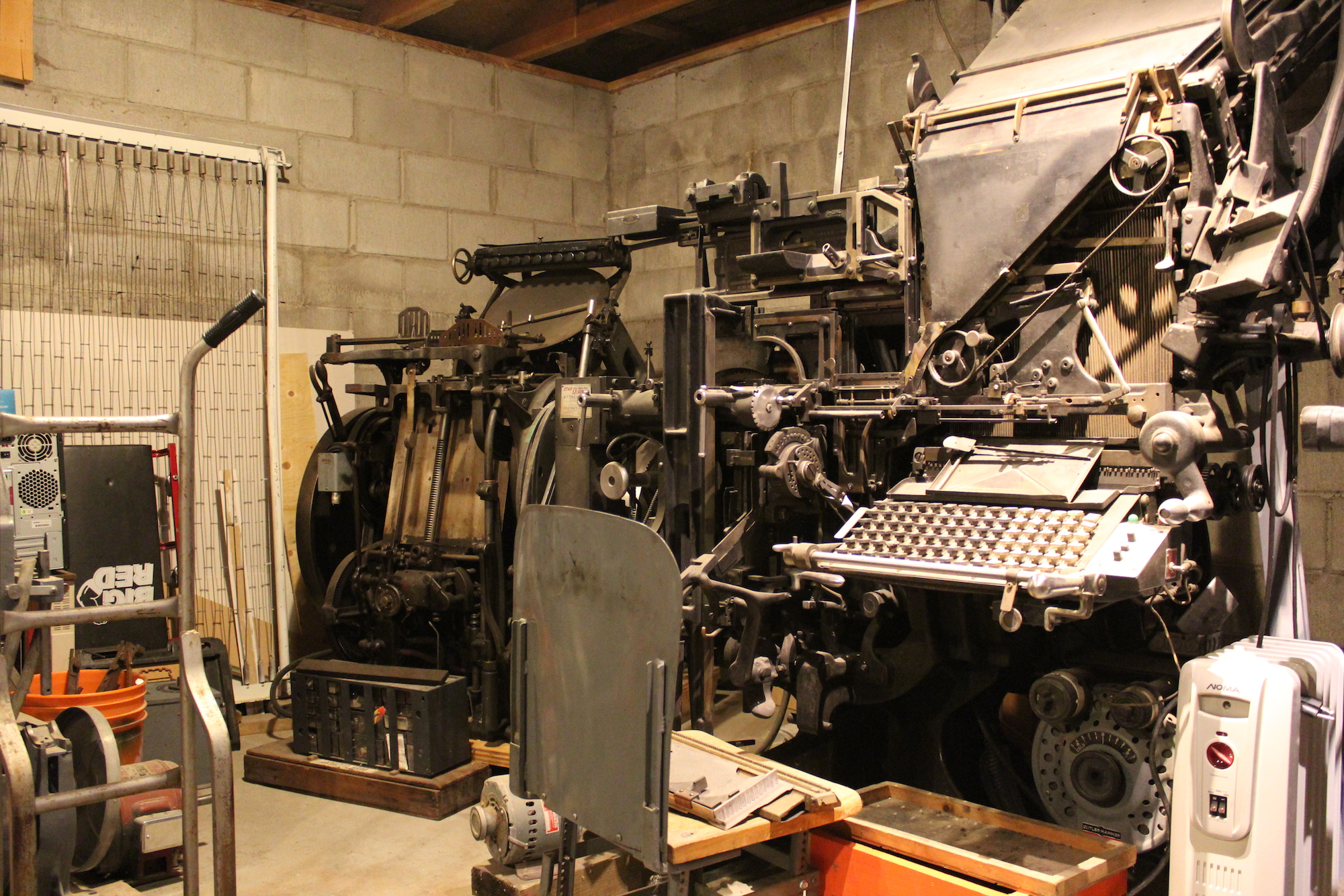 Because of the stable climate it provides, the rear half of my workshop contains the machines that make up the printing division of Beefchicken Industries. Two Linotypes currently occupy the majority of the space, with a Chandler & Price press occupying the remainder.